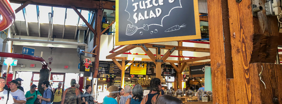There is a lot to see and eat at Granville Island Public Market in Vancouver, British Columbia in Canada, but what about to drink? Well if you are in the mood for a natural refreshment, Fraser Valley Juice and Salad has you covered. Here you have some options to choose from their colorful menu. They even give you the choice of adding yogurt or chocolate syrup too. Mmmm…mmm!