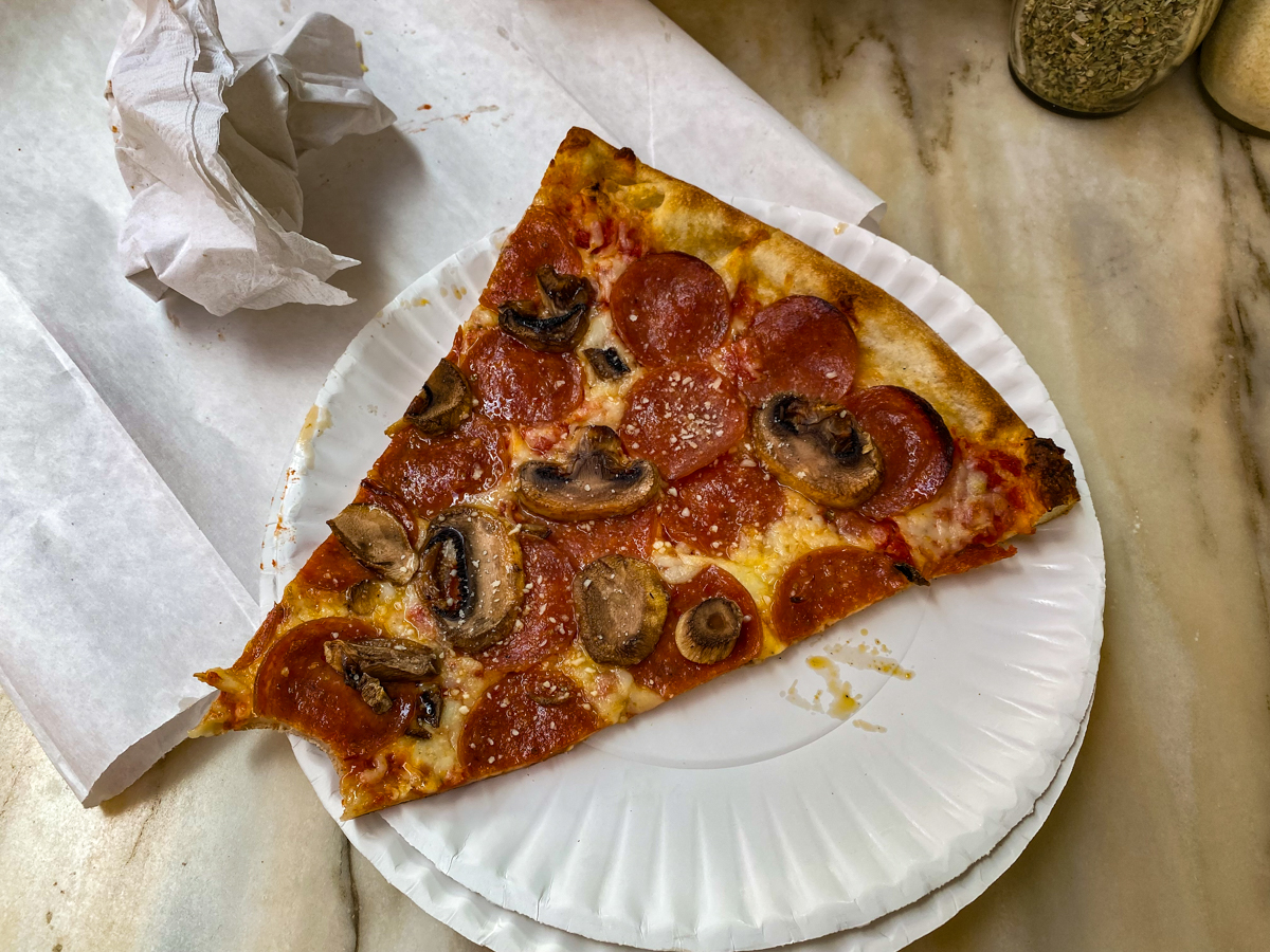 I enjoyed the taste of my pepperoni and mushroom pizza slice, it was thin and not too salty.