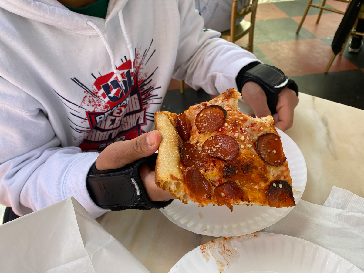 We reached the theater, got our tickets, and waited. We had arrived 30 minutes early and Diego’s stomach reminded him of the pizza that was just down the block and he asked if we could quickly go and have a slice. As we walked up, there was a side order window facing the street.